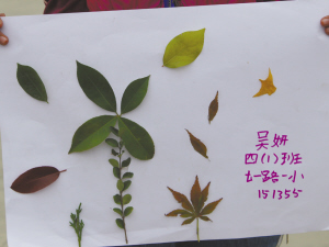 小记者排成两队,边走边捡树叶,刚走几步就发现了很多黄黄的银杏叶,我们捡了一些又大又黄的银杏树叶。还有四季青的叶子、又长又细的柳树叶,红红的梧桐树叶……很多。