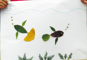 在周口公园,我和妈妈拣了各种颜色、各种形状的许多树叶。在老师的组织下,我和妈妈开始了创作。先拼小鱼吧,用剪刀剪好小鱼的头、身子、尾巴和眼睛,咦?没有黑色的树叶,怎么做眼睛呀?哈哈,难不倒我。我找了一片深绿的叶子,用黑色的彩笔一上色不就成了吗?鱼儿拼好了,水草当然不能少了。