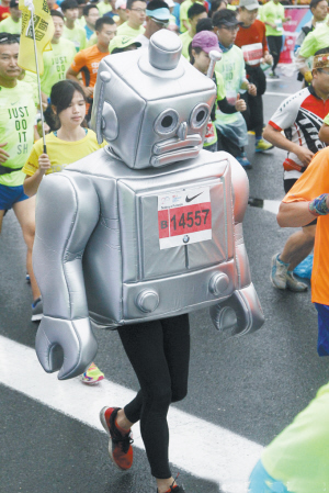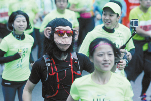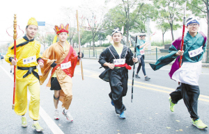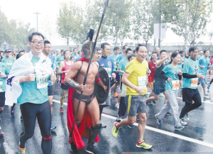 11月8日7时,2015上海马拉松在金牛广场起跑,由于日前刚下过雨,地面湿滑,但跑者热情不减,在当中一群“妖魔鬼怪”更是一道别致的风景线。
