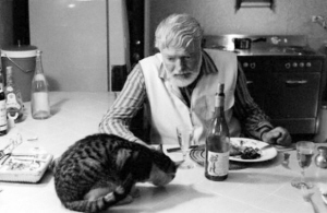 作家海明威正在与猫共进晚餐,摄于1958年。