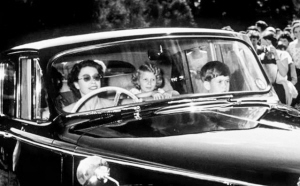 英国女王伊丽莎白二世驾车载着查尔斯王子和安妮公主,摄于1957年。