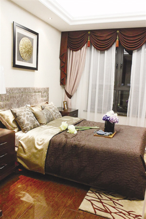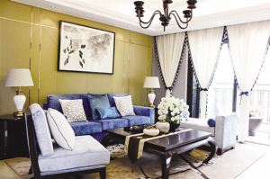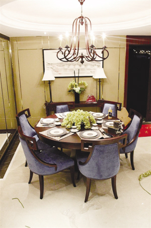 中式风格的用色上,往往和红色、棕色联系在一起,但这套房子却创新地采用蓝色。设计师漩子说,业主在外打拼,回家就是想获得安静的感觉。所以,采用“尊贵蓝”,既显高档,又显安静,符合客户的需求定位。