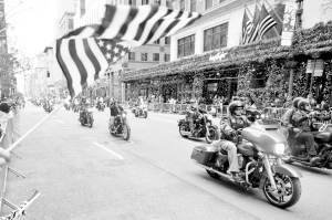 11月11日,摩托车骑手在纽约曼哈顿第五大道参加退伍军人节游行。