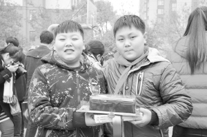 11月13日上午,由川汇区妇联、川汇区教体局、北斗达英语学校联合发起的“点亮微心愿,共筑中国梦”微心愿圆梦活动在我市新民小学举行。活动中,北斗达英语学校不但为新民小学每名学生送上学习书籍,还倡议本校学生为新民小学留守儿童每人精心准备一份礼物。图为孟书乐同学向新民小学吴邦杰同学赠送礼物,两人并结交为好朋友。记者 刘华志 摄