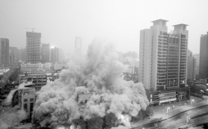 11月15日7时,西安市高新二路16号高层建筑定向爆破拆除获得圆满成功。据了解,该大楼地下1层、地上26层、高118米,总建筑面积37000多平方米,仅完成主体和外立面建设,至今未正式投用。目前,因闲置时间较长,该大楼已不具备改造使用条件。未来,将在该大楼原址建造一个新的商业综合体。据悉,这是目前国内城市爆破拆除中最高的楼房,成为“全国第一爆”。新华社记者 陶明 摄