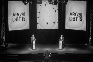 在10月25日全国大选中得票率领先的执政联盟“胜利阵线”候选人丹尼尔·肖利与反对派竞选联盟“变革”候选人毛里西奥·马克里11月15日在布宜诺斯艾利斯大学法学院围绕未来施政路线举行政策辩论。双方将在11月22日举行的第二轮投票中一决胜负,此次辩论是他们改变中间选民投票意向的重要机会。新华社发