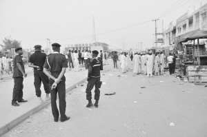 11月18日,在尼日利亚北部卡诺州首府卡诺市,安全人员在手机市场连环自杀式袭击现场外执勤。