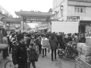 当日周口晚报记者在荷花市场看到,南中门、两个东门、北正门均竖起了印有“周口市荷花市场整合升级领导小组办公室公告(第六号)”内容的巨大宣传牌,公安、城管、市场管理等多家部门的工作人员现场维持商户搬迁秩序(如图),大量商户有条不紊地将货物逐车拉出市场,搬入位于华耀城的新商铺。