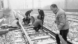 11月24日,我市迎来今冬第一场雪。为确保铁路行车安全,漯阜铁路有限责任公司组建党团员突击队清扫道岔积雪,涂油、喷洒防冻液,确保设备正常运转,同时在客运站台铺设地毯、防滑垫等,防止旅客摔伤。图为突击队队员清扫道岔积雪。