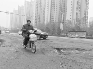 12月1日上午,周口晚报记者在周口大道与兴旺路交叉口看到,该路口到处是坑,很多快速过桥的机动车行驶到这里都急忙刹车,可就是这样,不少车辆还频频“中招”。一辆机动三轮车行驶过来,坐在驾驶座的一名妇女怀里抱着小孩,一个躲闪不及,机动三轮车陷进深坑,受到惊吓的孩子大哭起来。接着,一辆面包车掉进一个大坑里,轮胎打滑,司机加大油门才从坑里“爬”出来。