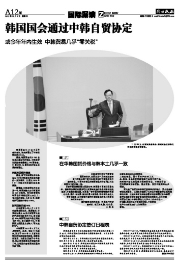 韩国国会通过中韩自贸协定