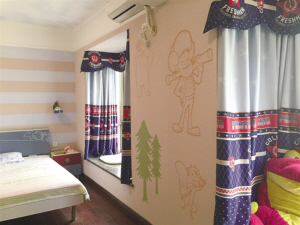 苏女士儿子还在读幼儿园,因此她为儿子准备的房子充满了童趣和童真:整间儿童房以蓝色为主色调,家具、窗帘及床品均为深深浅浅的蓝色搭配。在一面留白的墙面上,特意请专业人士用硅藻泥“画”上了可爱的“熊出没”中的卡通画像,有扛着猎枪的光头强,有憨态可鞠的熊大,以及绿色的“松树”,线条简洁又形象生动的壁画人物,为儿童房加分不少。