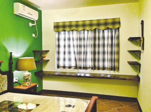 石女士新居装修整体为美式乡村风格,儿子的房间也延续了这种风格,但看起来更赏心悦目:墙面使用了绿色和米色两种颜色的涂料,对比强烈的撞色产生了时尚大气的效果。而带有美式风格的格子布窗帘,画龙点睛,简单又朴素的情调,使整个空间的色彩不至于过于跳跃。