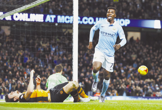 英格兰联赛杯 曼城晋级四强 当地时间12月1日,曼城队球员伊海亚纳乔(右)庆祝进球。当日,在2015~2016赛季英格兰联赛杯四分之一决赛中,曼城队主场以4∶1战胜赫尔城队,晋级四强。新华社发