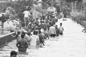 12月2日,在印度金奈,人们在洪水泛滥的道路上涉水前行。