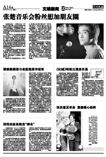 演出过半后,张楚提出要休息一下喝口水。再次登台后,张楚与观众有了一次互动。他看了看台下:“刚才你们看了会儿手机?发了发微信吧?”台下观众则呼应道:“朋友圈都被你刷屏了!”还有女粉丝大喊:“要你的二维码,扫一扫!”张楚乐了,说这个提议不错,下次演出可以投影一个大的二维码。