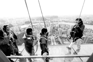 12月5日,位于广西柳州市地王国际财富中心76层的云顶观光项目正式开放。该项目占地面积388平方米,是集旅游、观光、游乐为一体的城市高空景观旅游景点。其中,空中透明玻璃栈道位于云顶观光层的外围,总长208米、宽1.5米。游客栈道体验为“5+2”模式,即每次5位宾客和2位安全教练一同完成体验,时长约30分钟。据了解,这是全国第四家、广西首家户外玻璃观光栈道。新华社发