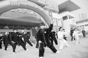 12月7日,在周口中心城区一小区门前,太极拳爱好者进行太极拳表演。