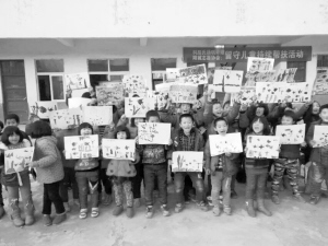 12月4日下午,商水县阳城志愿者协会十多名志愿者走进该县固墙镇农村小学,开展科颜氏杨帆计划留守儿童持续帮扶活动。活动中,志愿者锻炼了留守儿童的动手能力,开阔了留守儿童的视野。图为留守儿童展示绘画作品