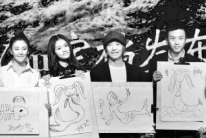 当天,现场还设有一个环节,就是让每个主创都画出一幅自己心目中的美人鱼的图画。结果一圈下来,还是周星驰自己画得比较靠谱。而他亲手绘制的3幅海报上的画纯属调侃用(如左小图),显示了周星驰电影一贯有之的“无厘头”风格。