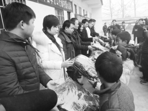 当日,爱心人士分别从周口、郑州出发,带着棉衣等礼物来到西华县李方口小学。下课期间,爱心人士把一件件棉衣发给留守儿童(如图)。“谢谢叔叔阿姨。”接过礼物,留守儿童连声感谢。