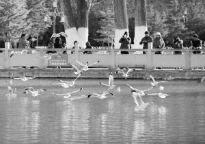 游览龙王潭公园的人们在观赏拍摄红嘴鸥(12月12日摄)。