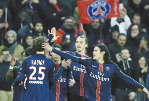 当地时间12月13日,巴黎圣日耳曼队球员伊布拉希莫维奇(右二)与队友庆祝进球。当日,在2015~2016赛季法国足球甲级联赛第18轮比赛中,巴黎圣日耳曼队主场以5∶1战胜里昂队。新华社发