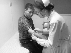 11日上午,在河南省肿瘤医院血液科病房内,护士为王争气注射了第一针造血干细胞“动员剂”。该院一名医生说,注射“动员剂”的作用是将骨髓中的造血干细胞推动到血液中,以升高白细胞数量。
