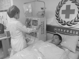 15日6时许,王争气注射了最后一针“动员剂”。8时20分,他进入河南省肿瘤医院造血干细胞采集室,开始进行造血干细胞采集。王争气的两只手臂都插着针和输液管,输液管连着床头一台机器。医务人员启动机器,鲜血通过输液管缓缓流进机器。“除了手臂上打针有点痛外,其他没啥感觉。”躺在床上,王争气笑着对王锦申说。