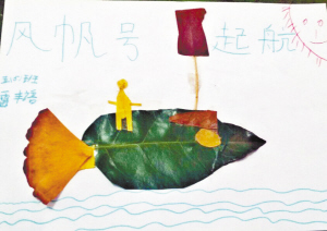 小记者雷丰语手工树叶粘贴画《扬帆远航》