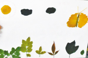 小记者寇云晓手工树叶粘贴画《美丽的金鱼》