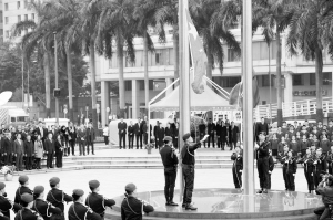 澳门特区行政长官崔世安、中央政府驻澳联络办公室副主任陈斯喜、外交部驻澳特派员公署特派员叶大波、解放军驻澳门部队司令员王文,以及特区政府各部门官员、社会各界代表约300人出席了升旗仪式。