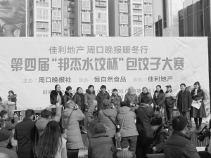 本报讯 12月20日,佳利地产、周口晚报暖冬行——第四届“邦杰水饺杯”包饺子大赛决赛在佳利广场举行,这是为庆祝创刊12周年,周口晚报社与广大读者互动进行的一场大型公益活动。决赛共集结高手162人,分成81组,现场角逐“包饺子王”。