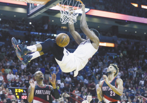 当地时间12月20日,热火队球员怀特塞德(上)在比赛中扣篮。当日,在2015~2016赛季NBA常规赛中,迈阿密热火队主场以116∶109战胜波特兰开拓者队。新华社发