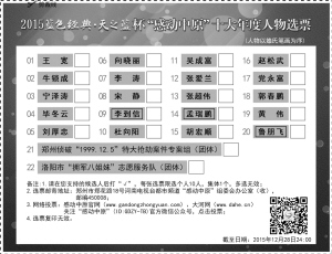 1.候选人事迹及纸质选票刊登在12月22日的《河南日报》《大河报》《东方今报》《河南商报》《河南法制报》《郑州日报》《郑州晚报》以及各省辖市党报或都市报上;