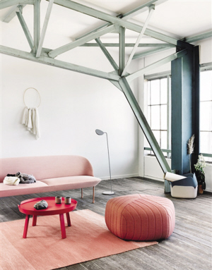 有时候粉色也不一定是女人的专属色,在客厅里放上一个粉色沙发、铺上一个粉色地毯,再搭配一个粉色小凳,整个客厅就会随着视觉的升温而显得温柔和温暖起来。