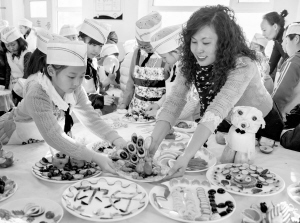 12月30日,呼和浩特市玉泉区石头巷小学师生在摆放水果拼盘。