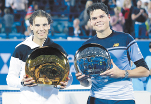 当地时间1月2日,纳达尔(左)与拉奥尼奇在颁奖仪式上。当日,在阿联酋阿布扎比网球表演赛决赛中,西班牙选手纳达尔以2∶1战胜加拿大选手拉奥尼奇,获得冠军。