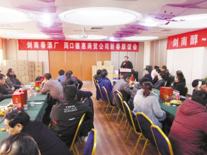1月2日上午,周口德惠商贸有限公司、剑南春酒厂联合举办新春联谊会,来自全市各地重点商户近百人共同分享一年来的收获,川汇区工商联相关负责人到会祝贺。德惠商贸有限公司是一家主营剑南春系列、绵竹大曲、衡水老白干等白酒、卡波纳鸡尾酒、拿破仑啤酒的商贸公司。公司做名酒不炒作价格,做真酒不沾染假劣,成立5年来赢得了广大消费者的认可。图为剑南春酒厂河南区域剑南醇运营中心主任王二伟先生在发表热情洋溢的讲话。