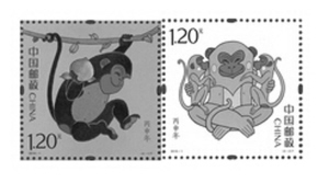 据了解,第一轮生肖邮票中猴票是一枚,第二轮猴票是两枚,第三轮猴票是一枚,第四轮猴票又回归为两枚。《丙申年》猴票一套两枚,其中一枚是公猴攀枝摘桃图,猴子手托寿桃,面带笑容,形象活泼可爱,生动传神;另一枚是母猴抱二子图,一只金猴抱着两只橘色的小猴象征亲情,也蕴含着阖家团圆、福寿双至的吉祥寓意。