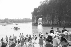 游客在广西桂林市象山景区游览。(2015年10月3日摄)