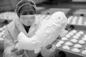 1月6日,河北省黄骅市一家面花生产企业工作人员展示刚刚出笼的鱼造型的面花,寓意“年年有鱼”。