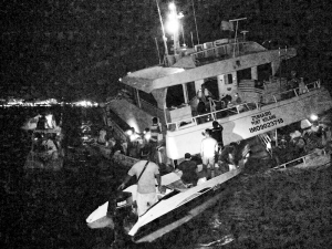 1月6日,在马来西亚沙巴州仙本那,救援人员在渡轮沉没现场施救。