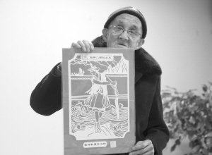 1月11日,张存舫老人展示他创作的“水浒108将”刻剪纸作品。