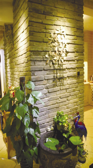 谢女士家是典型的混搭风格,既有东南亚的休闲,又有中式的古朴、西式的华丽。从厨房到餐厅的拐角,是家里一道美丽的风景:用青砖贴墙,营造了原生态的质感,上边挂着铁艺花卉,画龙点睛。最“吸睛”的是墙角摆着大石头水缸,上边漂浮着睡莲,里边还养着几条小鱼。石头水缸掩映在一丛丛油亮欲滴的绿萝内,沐浴在温暖的灯光里。
