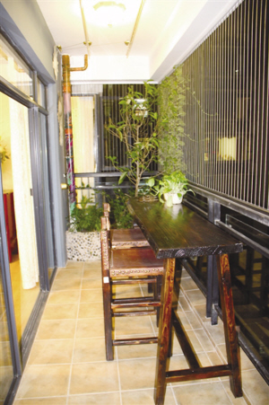 通过杨先生的阳台可见远山,一侧做了花盆栽种了一株桂花,摆上了吧台和高脚凳,并不复杂。试想,在月朗星稀的秋夜,晚风吹来桂花的幽香,是不是很惬意呢?杨先生说:“桂花是喜阳的,放在阳台正合适,但是,要想桂花长得大一些,培土要够深够厚才行。”