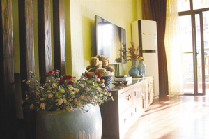 美式的家居装修,如何用花草增添美国乡村的田园气息?设计师菲菲开玩笑地说,用横渡太平洋的真花不现实,那就用假花、干花吧。在杨小姐的家里,她用仿真的雏菊修饰了电视背景墙:“这用来插花的陶罐,粗糙些、鲜艳些,反而能突出田园的风格。这些仿真花也不是以前的那种假花,仿真花仿真程度高,所以,价格和真花有一拼。”