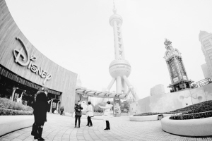 1月13日,游客在上海浦东陆家嘴迪士尼零售商店广场前拍照。