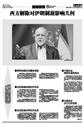 伊朗核问题全面协议1月16日正式执行。国际原子能机构当天发布报告,证实伊朗完成开始执行全面协议的必要准备步骤。欧盟和美国随后宣布解除对伊朗相关制裁,这将给伊朗和世界经济体系带来一系列影响。