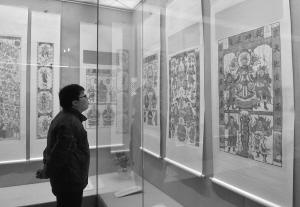 1月17日,观众在正阳门城楼内观看展出的河南安阳木版年画。